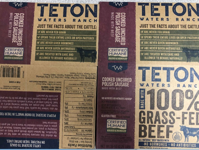 - 36-oz. packages containing three 12 oz. individually wrapped pieces of “TETON WATERS RANCH COOKED UNCURED POLISH SAUSAGE MADE WITH BEEF” with a Use/Freeze By SEP 16 2019 or Use/Freeze By SEP 19 2019.