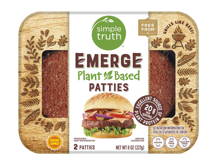 Simple Truth Emerge patties and grinds offer the same taste, texture and sizzle on the grill or in a pan as beef and are free of GMOs, dairy, gluten and soy. Simple Truth Emerge patties and grinds provide 20 grams of pea-based protein per serving and are located in the packaged traditional meat case.