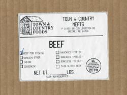 • 10- lb. box containing variously weighted bags of “Town & Country Beef for Stewing”