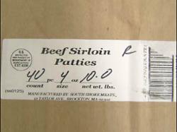 - 10-pound boxes containing 40, 4-ounce packages of “Beef Sirloin Patties.”