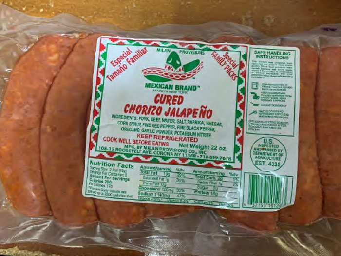- 14-oz and 22-oz vacuum-packed packages containing “MILAN PROVISIONS MEXICAN BRAND MADE IN NEW YORK CURED CHORIZO JALAPEÑO” with expiration dates of “JUN 12 21”, “JUN 13 21”, “JUN 14 21” and “JUN 15 21.”