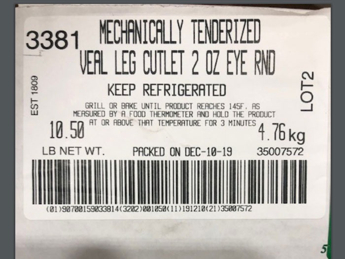 - 10-lb. bulk boxes containing “MECHANICALLY TENDERIZED VEAL LEG CUTLET 2 OZ CHUNKS” and EST 1809 and PACKED ON DEC-10-19 represented on the label.
