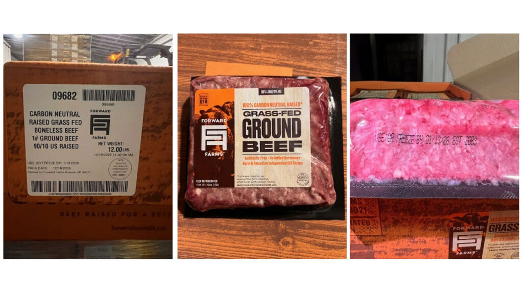 - 16-oz. (1-lb.) vacuum-sealed packages containing “FORWARD FARMS GRASS-FED GROUND BEEF” with “USE OF FREEZE BY 01/13/26 EST 2083” printed on the side of the packaging.