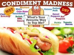The bracket features a wet condiment side and a dry condiment side. On the wet side, favorites such as mustard, relish, chili and coleslaw will take on sauerkraut, ketchup, BBQ sauce and mayonnaise. The dry condiment side features onions, cheese, tomatoes, sweet peppers, hot peppers, bacon, pickles and pulled pork. Each day fans will choose their preferred topping with the winners moving on until the ultimate champion is crowned.