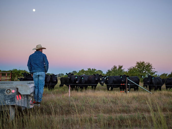 Noble Research Institute ranch team member Jeremy Westfall observes a herd of Angus cattle ahead of a move on Oswalt Ranch in Marietta