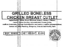 - 5-pound trays of “GRILLED BONELESS CHICKEN BREAST CUTLET.”