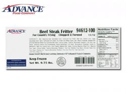 9.75-pound bulk cases of “ADVANCE FOOD COMPANY, Beef Steak Fritter, For Country