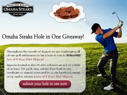 Details of the contest are posted on the Omaha Steaks Facebook page at www.Facebook.com/OmahaSteaks. Hole in one certificates or signed score cards may be mailed to Omaha Steaks Hole in One Giveaway at 11030 O. Street, Omaha, NE, 68137 or e-mailed to davel@omahasteaks.com Contest eligibility is limited to persons residing in the United States who are a minimum of 18 years of age.