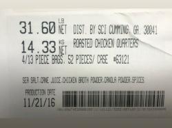- 5,477 cases of 35-lb. heat sealed bags containing 52 pieces of “Roasted Chicken Quarters – Sea Salt, Cane Juice, Chicken Broth Powder, Canola Powder, Spices.”