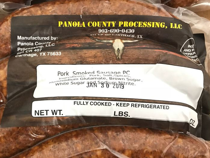 - 1.3-lb. vacuum-packed packages containing four pieces of “PANOLA COUNTY PROCESSING, LLC Pork Smoked Sausage PC” with packaging dates of Jan. 30, 2019 and Jan. 31, 2019.
