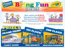 SALISBURY, Md. — Perdue Farms Incorporated today announced a national contest encouraging families to enter an original picture of how they bring fun to the dinner table for a chance to win valuable prizes including a cruise package, a year's supply of PERDUE® Frozen Fully Cooked Chicken and a prize pack of Crayola and PERDUE® products.