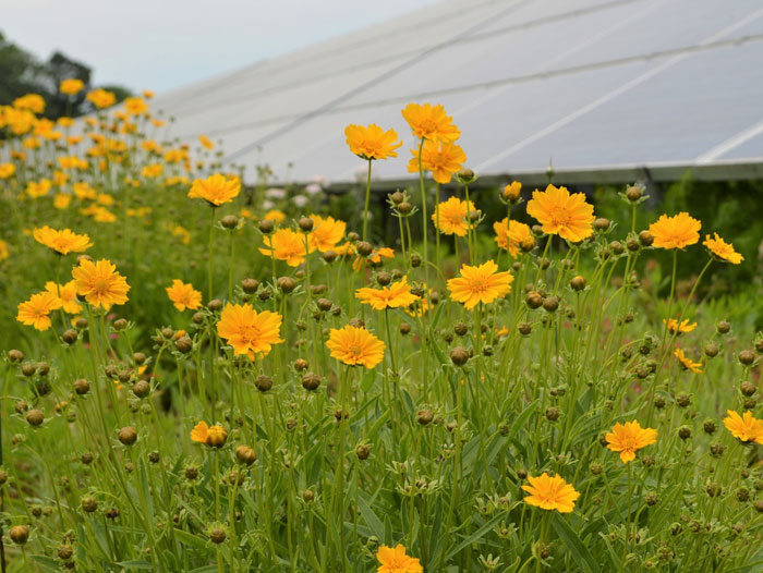 A pollinator-friendly ground cover consists of a variety of flowering plants that provide food in the form of nectar and pollen in each growing season. It contains a mixture of plants that bloom from early spring to late fall so that flowers will be available when pollinators are active. The species were selected to be low-growing to keep from shading the panels, as well as deep-rooted to be resilient to periods of intense sun and rain.