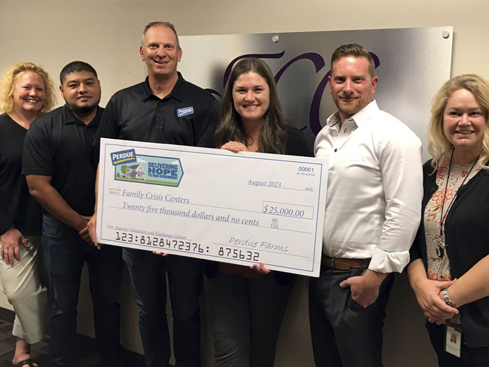 SIOUX CENTER, Iowa — Perdue Farms is supporting Iowa Family Crisis Centers with a $25,000 grant funded through the Franklin P. and Arthur W. Perdue Foundation as a commitment to improve the quality of life in its communities. The donation from Perdue’s charitable giving arm, a part of the company’s Delivering Hope to Our Neighbors® initiative focused on building strong communities, will support a family visitation and exchange center.