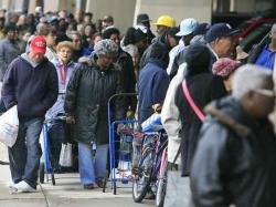 In a sign of difficult economic times, a massive line of people formed in South Philadelphia on Monday to receive free frozen meat, frozen dinners, and dairy products.