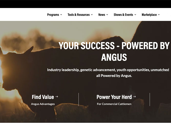 The main homepage gives visitors three main action points at the start: learn about Angus advantages, go to the commercial cattlemen’s corner or head to the member center. Each section has links, news and resources specifically curated for different types of Angus producers.