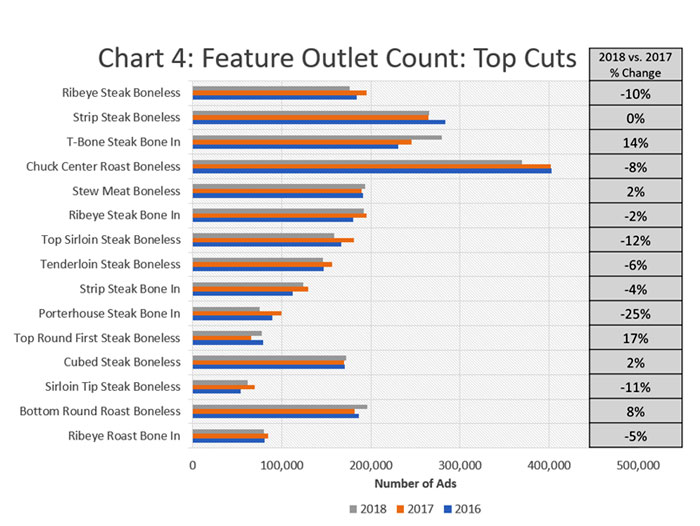 Diving into beef featuring data, primal and cut ads have averaged 80% of the total since 2012, with the 20% balance for Ground Beef (Chart 2). 2018 was a particularly robust year for Ground Beef ads (22%), and this share has increased slightly each year since 2014. That said, Loin cuts (including Sirloin) still accounted for the greatest share of beef ads in 2018 (24%), followed by Round, Chuck and Rib. The higher share of Ground Beef ads primarily replaced those for Carcass items (e.g. Cubed Steak, Stew Meat, Strips, etc.) and Chuck cuts.