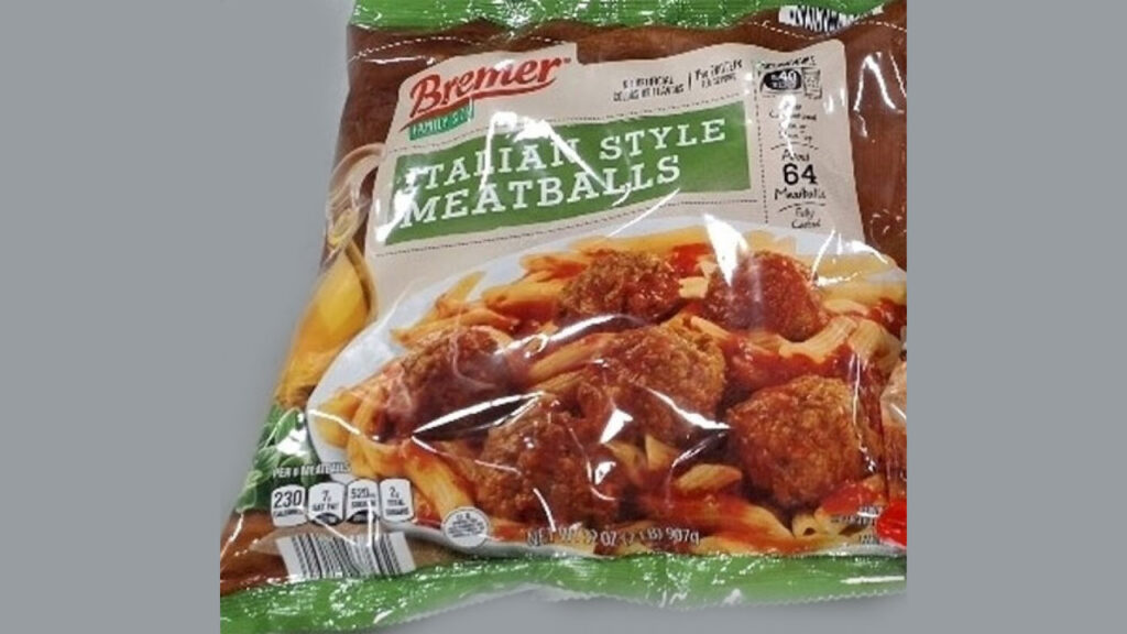 - 32-oz. printed poly film bag packages of fully cooked frozen “Bremer FAMILY SIZE ITALIAN STYLE MEATBALLS” containing “about 64 meatballs per package” with “BEST BY” date of “10/30/26” with timestamps between 17:08 through 18:20 printed on the back of the label.