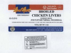 - 10 lb. boxes with two, 5 lb. bags of "Meal Mart Broiled Chicken Liver; Made for Further Thermal Processing"