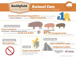 SMITHFIELD, Va. – Today, Smithfield Foods, Inc. released the first section of its 2016 Sustainability Report, providing comprehensive information about its industry-leading animal care initiatives and practices. Starting with its Animal Care section, Smithfield will issue its 16th annual report in segments each week throughout the month of May. A key highlight of the section is Smithfield's 87 percent progress toward converting all pregnant sows to group housing systems on company-owned farms by the end of 2017.