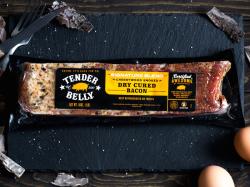 Tender Belly’s Signature Dry-Cured bacon takes two weeks to make, is cherrywood-smoked and comes from the extra tender bellies of Heritage Breed hogs. They're fed rich, 100 percent vegetarian diets, are antibiotic-free and raised in a crate-free environment which creates exquisite intramuscular marbling.