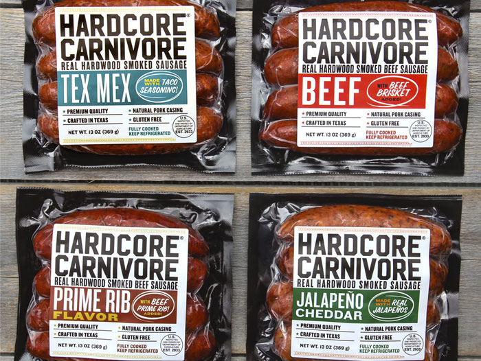 The new brand of Hardcore Carnivore premium sausages are certified GO TEXAN by the Texas Department of Agriculture, and feature gluten free ingredients, natural casings, and of course, a real hardwood smoked finish.