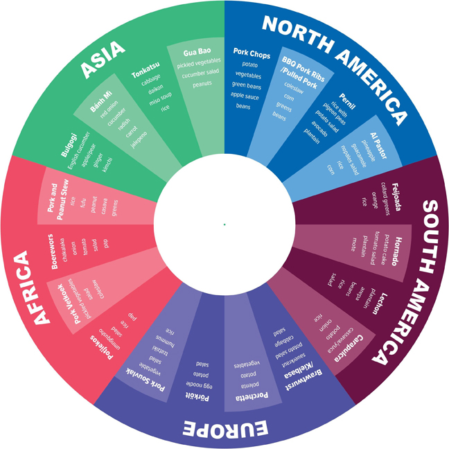 “Around the world, pork is a top protein choice, and we tried to illustrate this concept with our new flavor wheel,” says, Dr. Hicks-Roof. “This idea goes beyond nutrition, and deep into cultural and flavor experiences that honor centuries of food heritage and culinary traditions, all while pork acts as a carrier food that encourages us to eat more of the foods we know we should, like fruits and vegetables, in cuisines worldwide,” she explains.