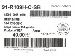- Approx. 40-lb boxes of "BEEF B/I RIB," bearing any of the following case codes: "91-R109H-C," "91-R109H-S," "91-R109H-C-SB," or "91-R109H-S-SB."