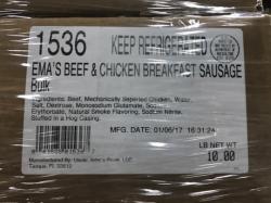 - 10-lb. bulk boxes of “EMA’S BEEF & CHICKEN BREAKFAST SAUSAGE Bulk, Manufactured By: Uncle John’s Pride, LLC” with case code 0-41085-01536-7.