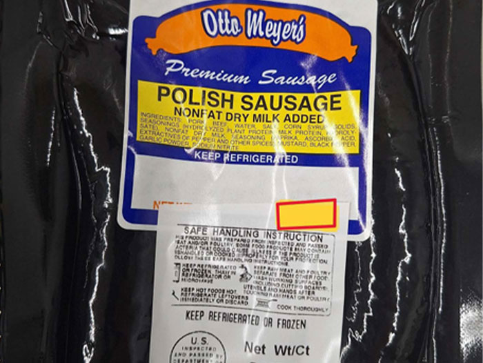 - 5″ x 8″ vacuum-sealed packages containing “Otto Meyer’s Premium Sausage POLISH SAUSAGE” with lot codes 24304, 24318, 24326, 24346 on a sticker.
