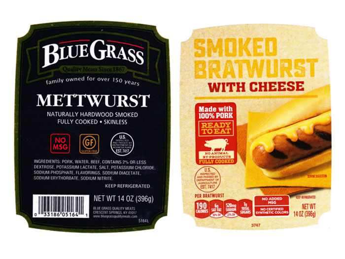 - 14-oz. plastic packages containing 6 pieces of “BLUE GRASS METTWURST,” with a use or freeze by date of July 23, 2020.