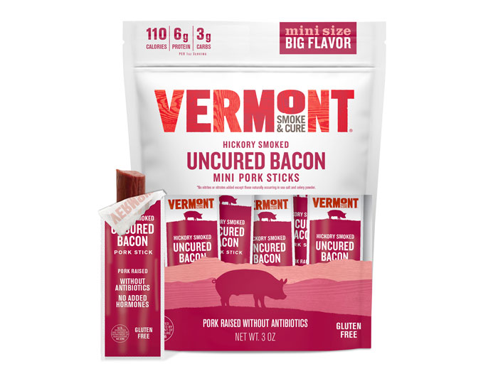 HINESBURG, Vt.–Vermont Smoke & Cure announces that its new Hickory Smoked Uncured Bacon Pork Mini Sticks are now available in retail and online stores. The Hickory Smoked Uncured Bacon Pork Mini Sticks taste like the protein you love, bacon, with a smoky flavor and a hint of maple syrup.
