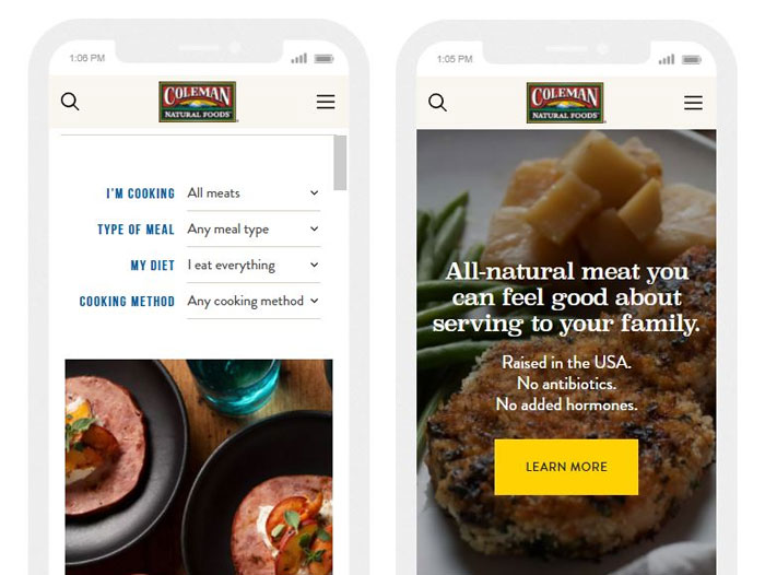 Coleman Natural Foods, producer of all-natural pork, beef and poultry products, has refreshed their website with a new, clean look that focuses on recipes and shortening the shopper journey.