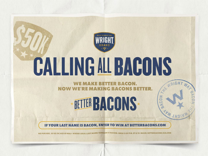 “Since we’ve mastered the art of crafting superb bacon, we wanted to extend our expertise to fellow Bacons,” said Lindsey Rice, brand manager for Wright Brand. “The Better Bacons contest is about paying it forward and delivering on improving the lives of those who have a special connection to bacon through their surname.”