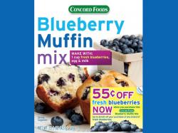 Concord Foods is providing instant redeemable coupons (IRC) for $0.55 off fresh blueberries with the purchase of the BLUEBERRY MUFFIN MIX from June 1 through August 31, 2013. “During the summer, blueberry availability is excellent. By offering a $0.55 off IRC, Concord Foods will help move blueberries during this key time and will introduce The BLUEBERRY MUFFIN MIX to a growing audience,” said Charles Olins, V.P. sales and marketing at Concord Foods Inc.