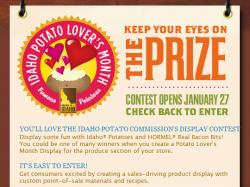 - Using fresh Idaho® potatoes (bag, bulk or both), an Idaho® dehydrated potato product, and HORMEL® Real Bacon Bits, create an eye-catching display following the contest rules (available at www.IdahoPotato.com/Retail).