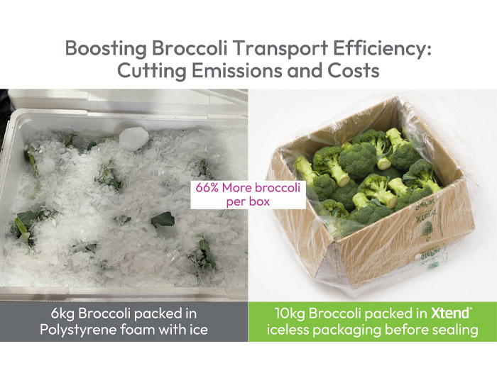 “We discovered multiple benefits to iceless Xtend packaging,” continues Otofuke’s Yamagishi. “First, it eliminates the space ice occupies, allowing us to transport 66% more broccoli per container. This slashes carbon emissions and transport costs, especially significant given the recent rises in shipping costs. With ice, each box holds only 6kg of broccoli; without it, we can pack around 10kg. In addition, one Xtend bag can hold 10kg of broccoli, making it more resource-efficient and eliminating the need for extra handling. The ability to transport ice less fresh broccoli across the continent on weight-constrained trucks has led to a net reduction in costs of more than 30%.”