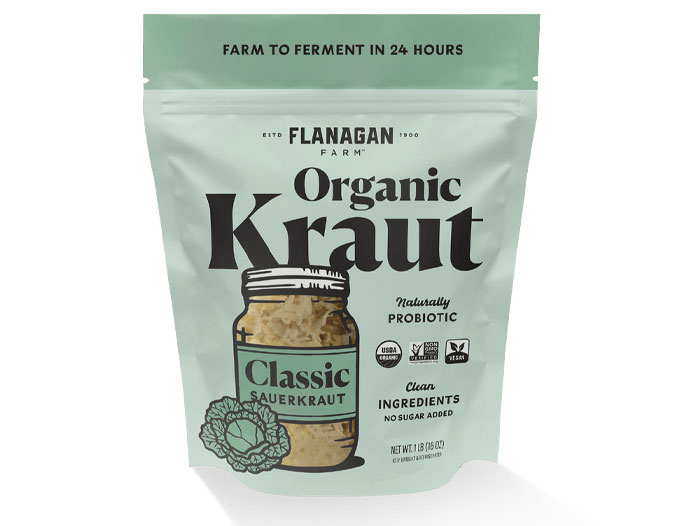 Flanagan Farm has launched five new flavors of sauerkraut, including Classic, Kimchi, Beet, Dill, and Roasted Garlic. The fermented, probiotic-rich superfood is available in convenient, resealable 16-ounce standup pouches, found in the refrigerated section. It is the most affordable, fresh organic sauerkraut in the market.