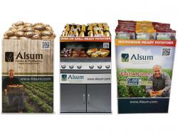 The Award-Winning Alsum Farms & Produce Bins are available to select retail grocers to display Alsum’s specialty and convenience packed potatoes including Fast and Fresh Steamer Potatoes, Ready to Bake or Grill Russets and Microwaveable Russet Singles. The one-of-a-kind produce bin capitalizes on the trust and expertise of the farmer, Larry Alsum, as well as the convenience of the product.