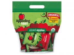 Appeeling Fruit, now celebrating 25 years in the sliced apple business, located near Reading, PA, is introducing a new Organic Sliced Apple pack in a stand-up pouch bag. This new pack will allow retailers and consumers a convenient package at an affordable price that contains six- 2oz bags. The bag stands up for a vertical presentation on shelf that faces the customer.