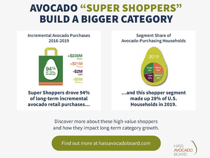 “As avocado shoppers move to higher purchase levels, they will find themselves as a member of the Super household segment,” explains Emiliano Escobedo, executive director of the Hass Avocado Board. “Understanding and engaging with this shopper group is key to the future growth of the avocado category.”