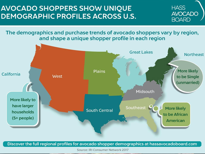 “Not all avocado shoppers are the same,” explains Emiliano Escobedo, executive director of the Hass Avocado Board. “These demographic and purchase insights help us see how the avocado shoppers in one part of the country differ from avocado shoppers in other parts of the country. This can help us spot and better understand growth opportunities in various regions and across various demographic groups.”