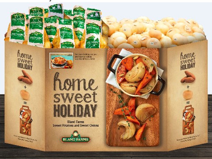 The merchandiser maximizes Bland’s Sweet Onion footprint and allows the retailer to co-merchandise with peak-season-seller, sweet potatoes, to increase sales. The highimpact design features finished dish images and a call-out to “TEXT for holiday recipes” to inspire purchase and usage. The messaging “Home Sweet Holiday” showcases key themes of the season that Bland Farms holds dear.