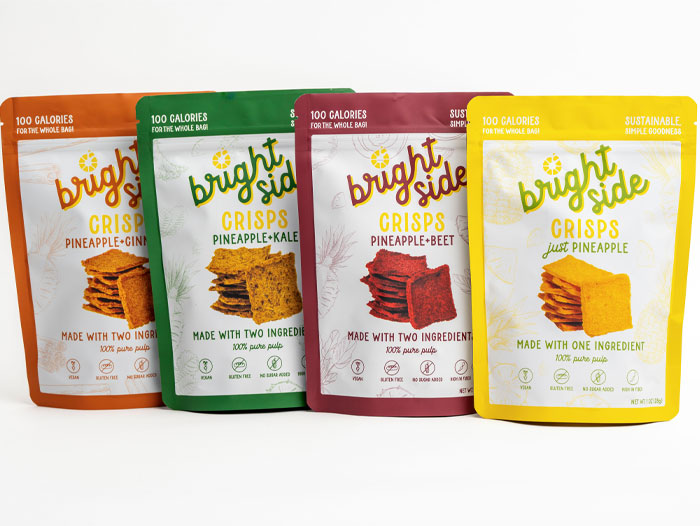 Bright Side Snacks are a new kind of fruit crisp cracker made simply with fruit and vegetable pulp. All flavors are made with only one or two ingredients: just pineapple, pineapple and beet, pineapple and kale, pineapple, and cinnamon. Furthermore, the product offers a sustainable solution by utilizing pineapple pulp and other pulp that would otherwise be thrown out after the fruit or vegetable is juiced.