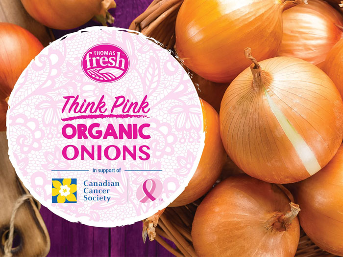Back for its second year and now available in organic, Thomas Fresh Think Pink 3 lb Organic Medium Yellow Onions are available from September to November. Proceeds from each pink packaged onion bag sold will support ground-breaking breast cancer research through the Canadian Cancer Society, the country’s largest national charitable funder of research into the disease.