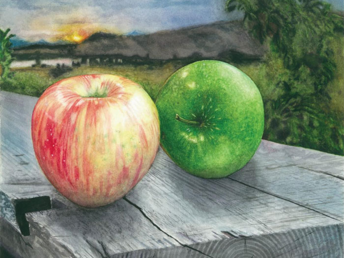 Wenatchee, Washington… On June 7, 2023, WAEF and Corteva Agriscience representatives announced the grand prize winner at Cashmere High School with Mr. Allan Pace, the art teacher, and art class peers in attendance. Cashmere High School junior Mykla Smith is the Grand Prize winner in the 28th Annual Washington Apple Education Foundation (WAEF) Year of the Apple (YOTA) Art Contest sponsored by Corteva Agriscience. Mykla received a check for $1,000 for her watercolor painting titled Apples at Sunset. Her artwork will be published on the 2023 Corteva Agriscience calendar poster.