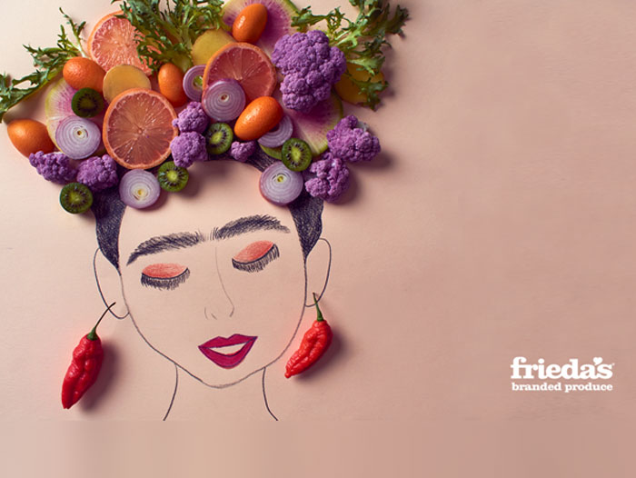 “When our team was brainstorming this piece of work, we were inspired to pair Frieda’s impact with someone who empowered women to change their mindset of what ‘normal’ meant. Kahlo created many self-portraits, which expressed her individuality—celebrating self-love. Her work often featured flowers, bold colors and even fruit. We hoped to capture her creative essence, style and unique look through this produce portrait,” says Lourdes Narvaez, Frieda’s senior creative manager and creator of the produce portraits. “Both Frida and Frieda refused to be ordinary, and that’s what Frieda’s and our produce portrait series is all about.”