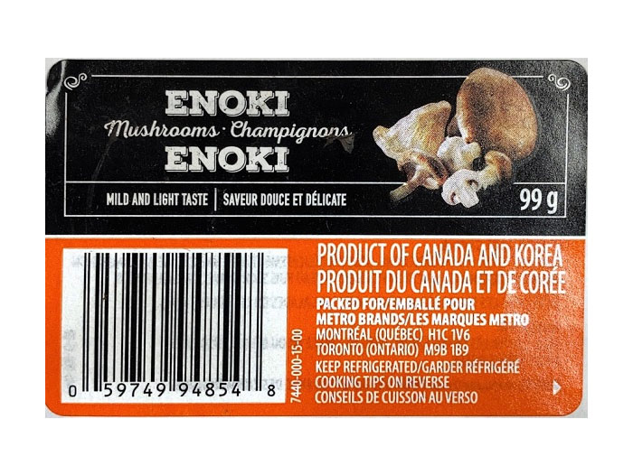 | None (Packed for Metro Brands) | Enoki Mushrooms | 99 g | 0 59749 94854 8 | All units sold up to and including May 14, 2021 |
