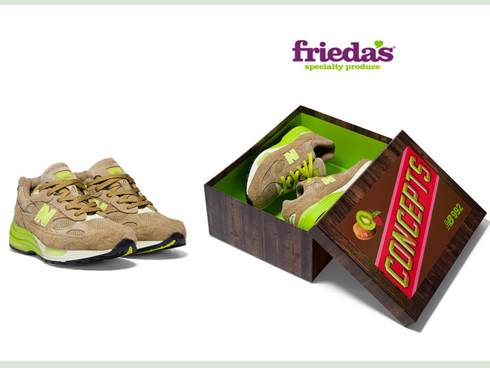 Design details for the New Balance 992 “Low Hanging Fruit” deliver a textured balance of brown suede and pops of neon green, giving overt nods to the kiwi. The shoes feature a playful twist through a strawberry footbed, harkening back to 1990s Americana when the pairing of strawberries and kiwi made a dynamic flavor profile. Concepts will simultaneously be launching a matching apparel collection including the Concepts Icon hoodie, sweatpant and T-Shirts — all garments that inform a new luxury streetwear sensibility.