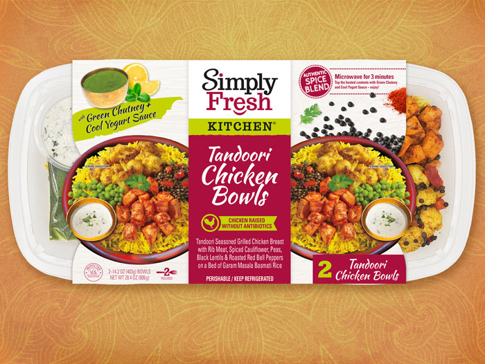 It is the company’s latest innovation in a long history of flavorful and portable single serve offerings under its Simply Fresh brand. The Tandoori Chicken Bowls with Green Chutney and Cool Yogurt Sauce includes Tandoori-seasoned grilled chicken breast, spiced cauliflower, green peas, black lentils, roasted red bell peppers complementing a generous portion of spiced Garam Masala basmati rice.