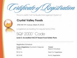 Crystal Valley Foods Certified SQF 2000 Level 2